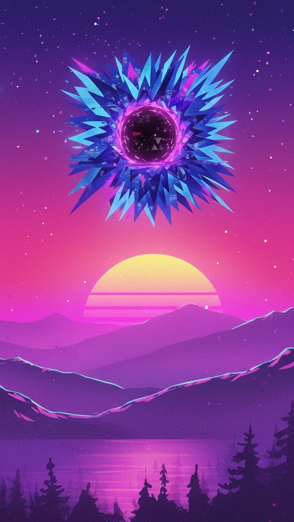 The crystal burst suspended over a synthwave mountain sunset. The idea that could not be contained, made visible.